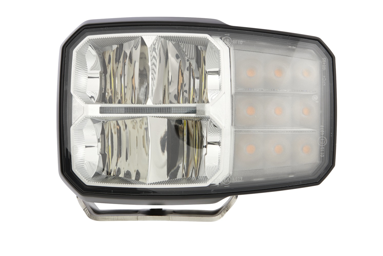 The C140 LED is the first combination headlight on the market to feature all light functions in LED technology: low beam, high beam, indicator and position light (as LED light guide). The special freeform reflector together with the LED light source produces significantly better light than headlights with halogen bulbs. With its daylight colour, the light appears far brighter to the eye and makes working at night less tiring. The housing of the C140 LED is made of aluminum and features cooling fins on its rear, which ensure heat removal from the high-power LEDs. A specially developed thermal design with temperature sensors prevents the headlight from overheating. With its robust, heavy-duty bracket and a lens made of toughened, shatterproof plastic, the headlight is particularly resistant to vibration and impact. Ideal for the tough conditions on construction vehicles (strong vibrations, dust, wetness, mechanical shock, etc.). The LED technology enables a lifetime of over 20,000 hours. The C140 LED headlight is a fully sealed, maintenance-free system: it obviates the need to replace bulbs, saving time and money for the final consumer. The low LED power consumption compared to conventional halogen headlights also saves fuel, further driving down costs. The C140 LED meets all ECE and SAE requirements and is both approvable and ideal for use almost anywhere in the world. Additional approvals are required for use in China.