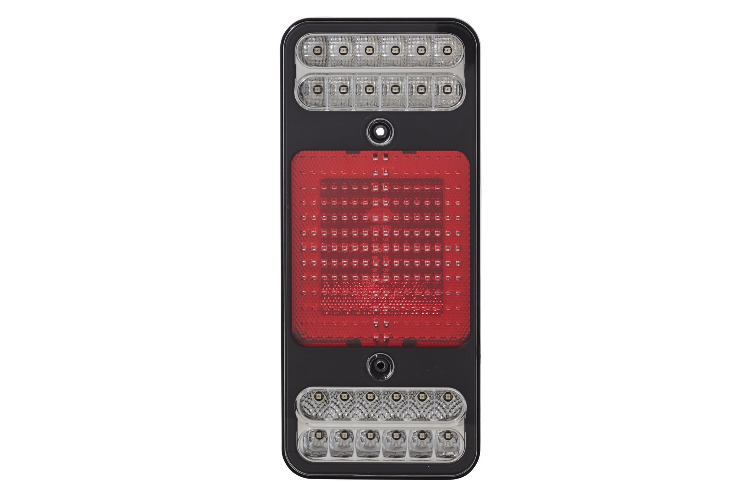 „COLUNA“ full LED combination rear lamp with 5 light functions for 12 V and 24 V towing vehicles and trailers. All light functions of the full LED combination rear lamp (tail light, stop light, direction indicator, rear fog lamp and backup lamp) exclusively feature LED technology. The tail light is produced by a ground-breaking patent-registered flat LED light guide in combination with the reflex reflector. And this light guide succeeds in producing illumination which is especially homogeneous. As a result, the tail light function, with its large surface area of around 145 cm², is exceptionally visible in the dark and thus enhances road safety. 12 V and 24 V variants of this extremely flat surface-mounted full LED light are available for towing vehicles and trailers. A range of different applications on the vehicle are possible using EasyConn or AMP connectors and the front or rear fixing options.