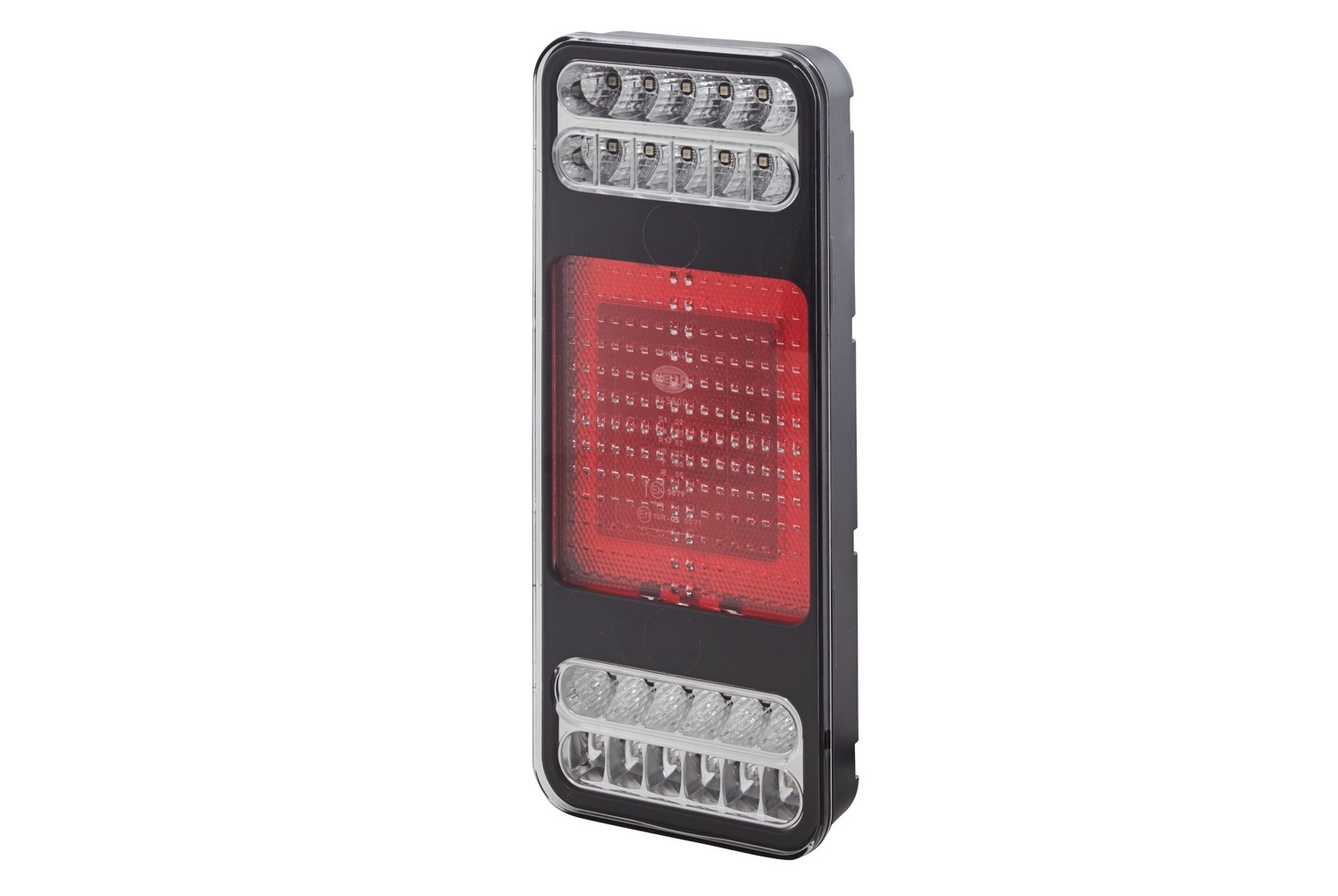 „COLUNA“ full LED combination rear lamp with 5 light functions for 12 V and 24 V towing vehicles and trailers. All light functions of the full LED combination rear lamp (tail light, stop light, direction indicator, rear fog lamp and backup lamp) exclusively feature LED technology. The tail light is produced by a ground-breaking patent-registered flat LED light guide in combination with the reflex reflector. And this light guide succeeds in producing illumination which is especially homogeneous. As a result, the tail light function, with its large surface area of around 145 cm², is exceptionally visible in the dark and thus enhances road safety. 12 V and 24 V variants of this extremely flat surface-mounted full LED light are available for towing vehicles and trailers. A range of different applications on the vehicle are possible using EasyConn or AMP connectors and the front or rear fixing options.
